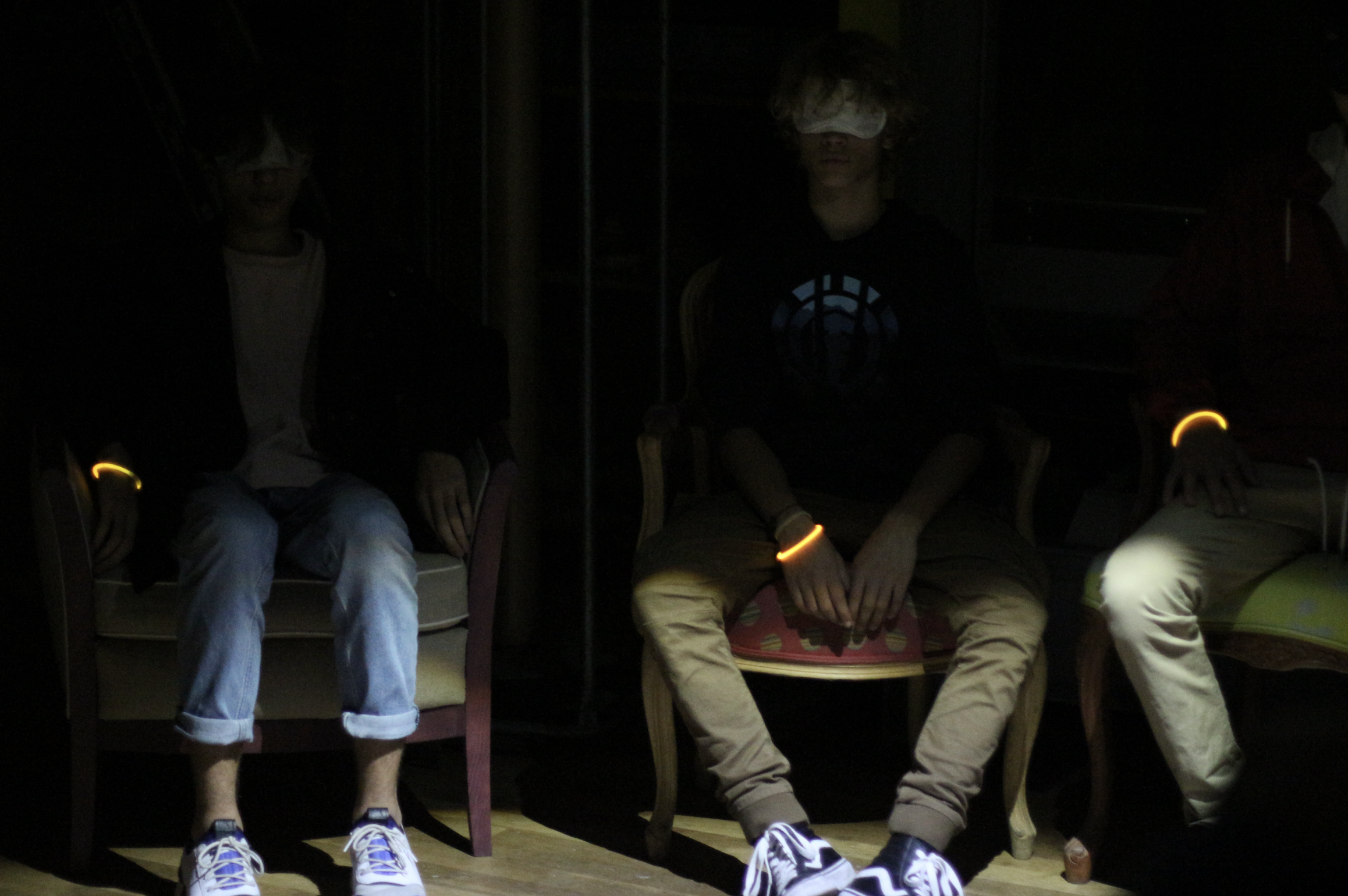 Assis avec un masque de nuit dans l’atelier de marqueterie, nous lisions un récit créé détaillé des différents ateliers, tout en leur donnant de la matière à toucher : quand nous étions dans l’atelier métalerie, du laiton, tapisserie, de la mousse, etc.
